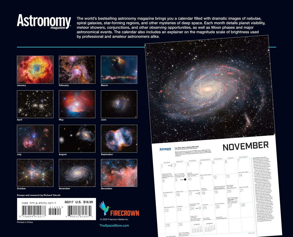 The world’s best-selling astronomy magazine brings you a calendar filled with dramatic images of nebulae, spiral galaxies, planets, star-forming regions, and other mysteries of deep space. Each month details planet visibility, meteor showers, conjunctions, and other observing opportunities, as well as Moon phases and major astronomical events.